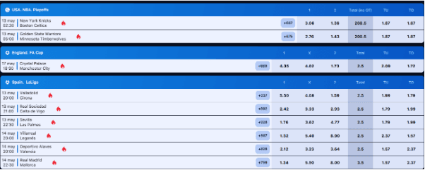 • Basketball: Betting options typically cover leagues like the NBA and EuroLeague, with markets including moneyline, point spreads, totals, and player performance props.