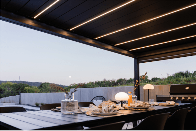 Layered lighting in a top-quality aluminum pergola sets the perfect ambiance